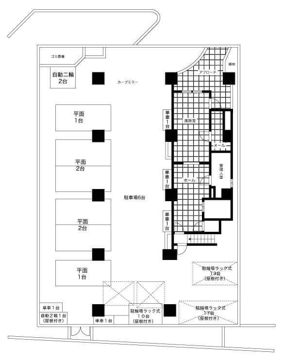 | 共用設備 | 玄関オートロック方式(非接触キー使用) エレベーター 1基 ※エレベーターホールにモニター設置 ※エレベーター呼出し 1階のみ非接触キー対応 防犯カメラ 各所設置 1階エントランスホールにエアコン設置 宅配BOX 非接触キー対応(登録必要 無料) 駐車場(有料) 単車置場(有料) 自転車置場(有料) 管理人常駐 | ||||