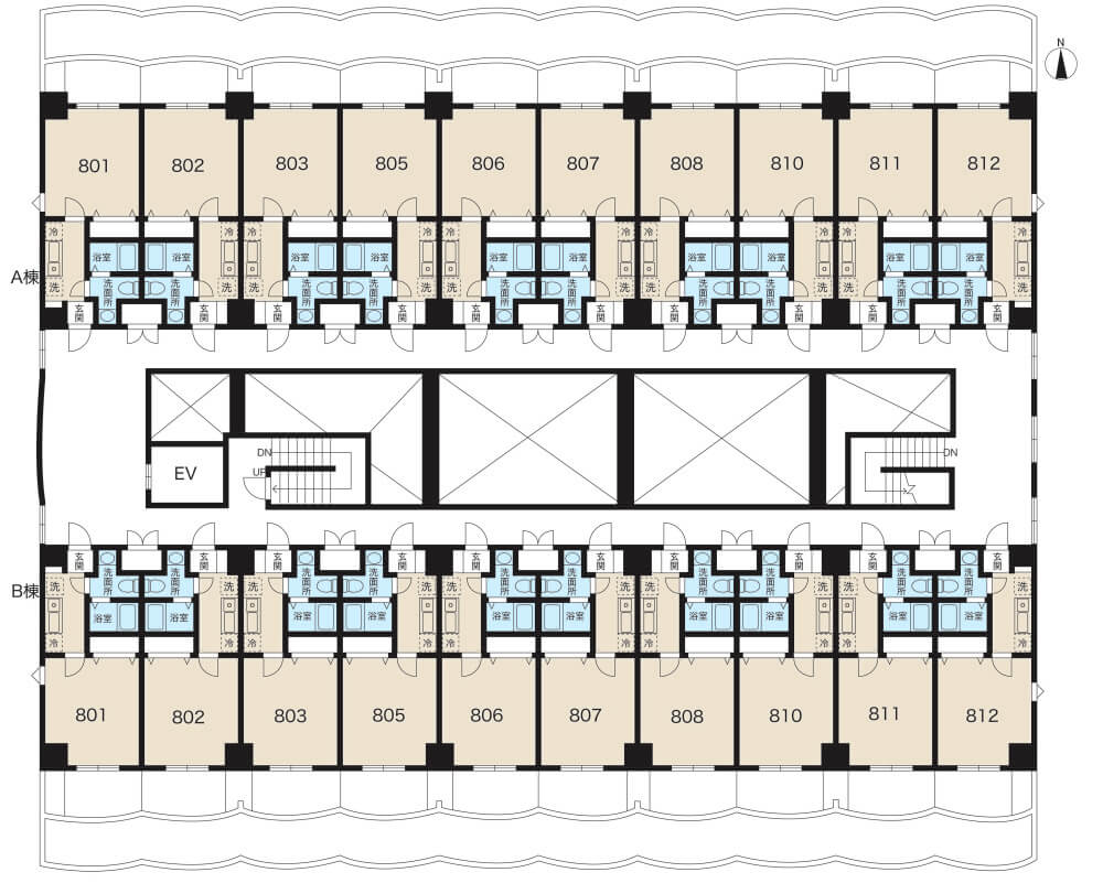 室内設備 | キッチン(ガス) ガス給湯器 洗濯パン付 エアコン 温水洗浄便座 インターホン 全室照明器具付 Bタイプのみ洗面化粧台 インターネット回線(別途加入必要) ※ フレッツ光ネクスト auひかり eo光 J:COM NURO光 テレビ配線 CATV(J:COM 地上波のみ無料) BSアンテナ | ||||